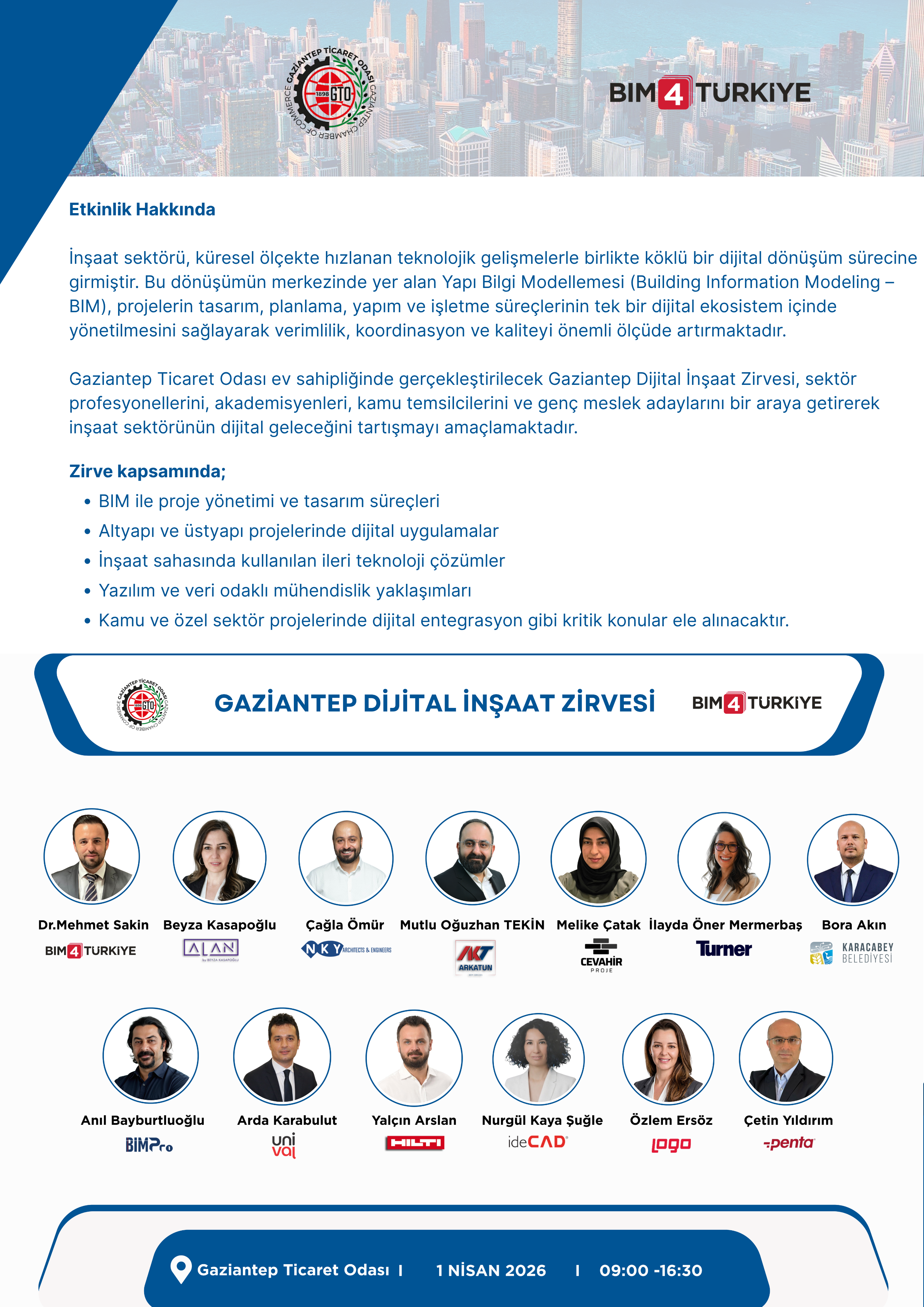 Gaziantep Ticaret Odası ev sahipliğinde gerçekleştirilecek Gaziantep Dijital İnşaat Zirvesi, sektör profesyonellerini, akademisyenleri, kamu temsilcilerini ve genç meslek adaylarını bir araya getirerek inşaat sektörünün dijital geleceğini tartışmayı amaçlamaktadır.